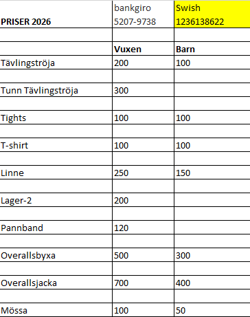Lena Lundsten håller i beställningar av våra föreningskläder. Vi subventionerar dessa, lite för vuxna mer för ungdomar. Aktuella priser finns i tabellen nedan.